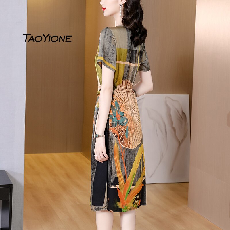Summer Vintage Print Silk Dress Women Short Sleeve Beach Party Dresses For Women 2023 Korean Midi Sundress Women Casual Vestidos