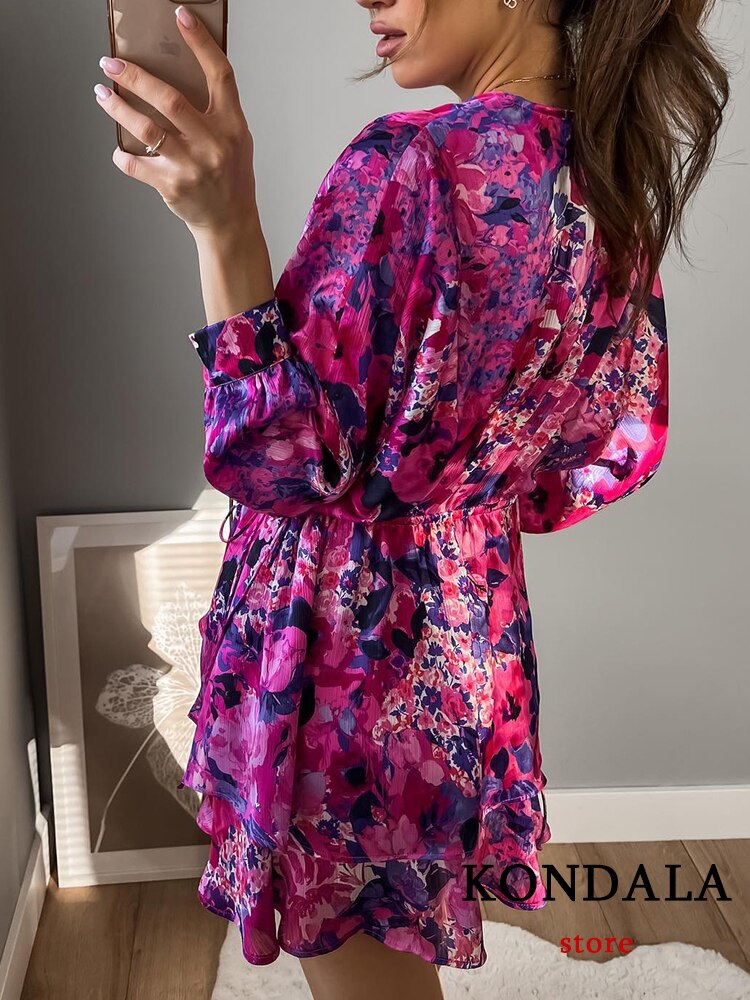 KONDALA Vintage Flower Print Ruffles Mini Dress Women V Neck Long Sleeve Satin Dress Fashion 2023 Summer Spring Holiday Dress