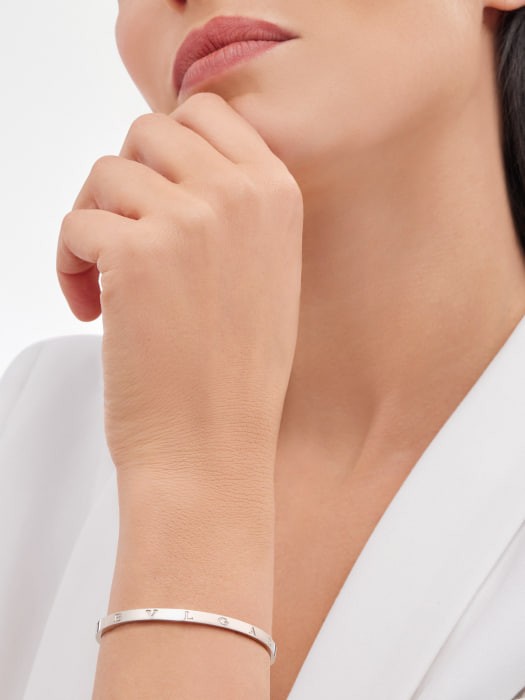 The B.ZERO1 series 18K rose gold bracelets are rooted in BULGARI's Roman history, presenting a timeless blend of culture and modernity, reflecting contemporary elegance. Inspired by the curved inscriptions on ancient Roman coins, the collection logo has been reinterpreted to create a unique and classic design element. This sleek and versatile bracelet can be mixed and stacked to your heart's content.