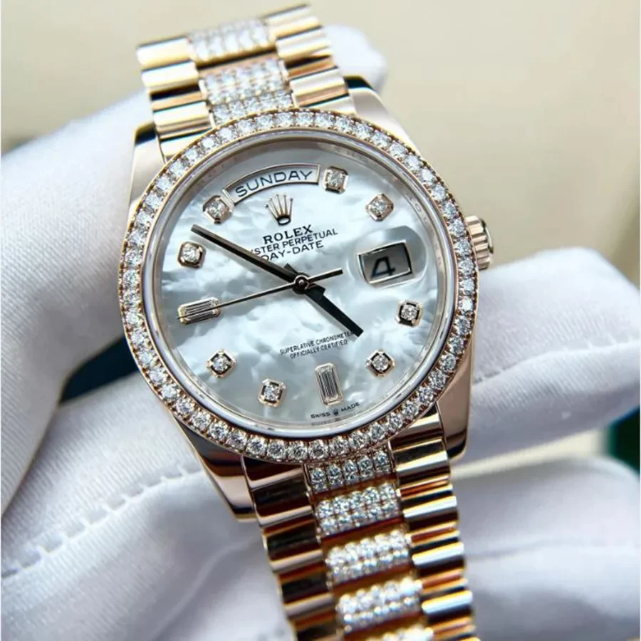 Đặc biệt, bên cạnh những chi tiết cổ điển, chiếc đồng hồ này cũng thế hiện tinh thần hiện đại với việc kết hợp giữa chất liệu vàng 18K cùng với rất nhiều viên kim cương được nạm kín trên mặt số, viền bezel cho đến dây đeo. Ngoài ra, mang đến một sự thu hút tự nhiên vào mặt số đồng hồ, Rolex 128345RBR MOP có vạch số là những viên đá cùng bộ kim thanh mảnh, sang trọng.