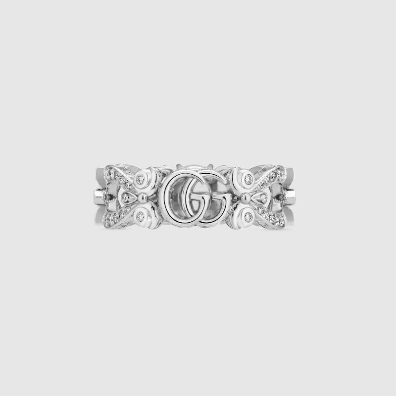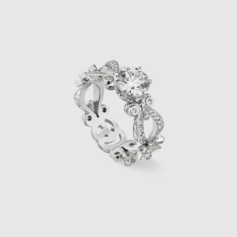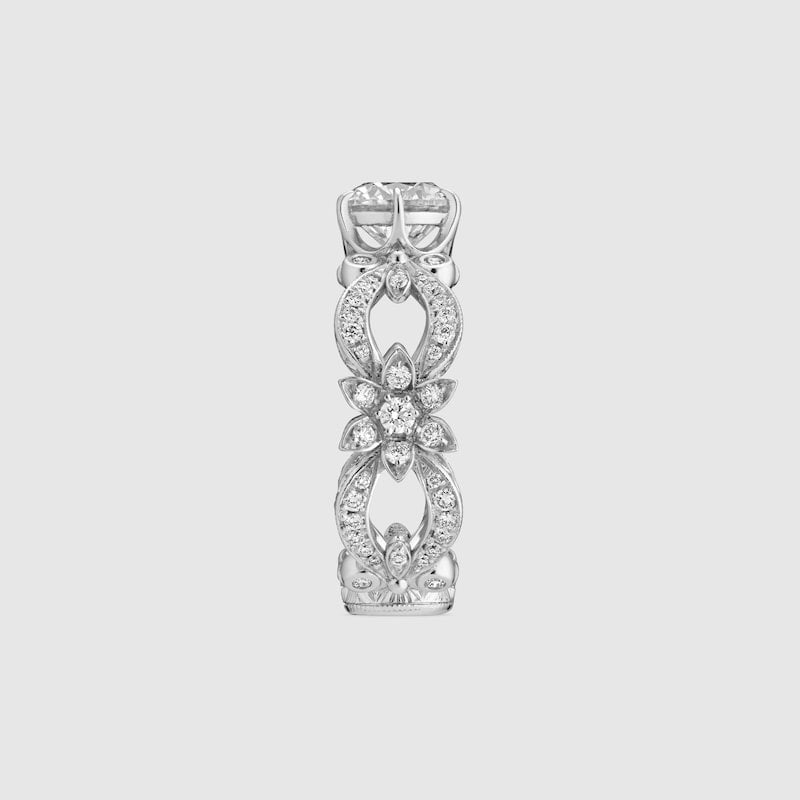 The Flora floral print was created by Italian painter Vittorio Accornero and appeared on the silk scarf designed for Princess Grace of Monaco in the 1960s. Since its inception, this jewelry series has continued to incorporate the femininity and chic charm of prints, interpreting them from a new perspective. This ring is made of white gold and features a solitaire diamond. The diamond-encrusted flower-inspired pattern pays homage to the origins of the collection's name. The brand's monogram pattern serves as an exquisite logo detail to highlight the brand's connotation in a low-key manner.