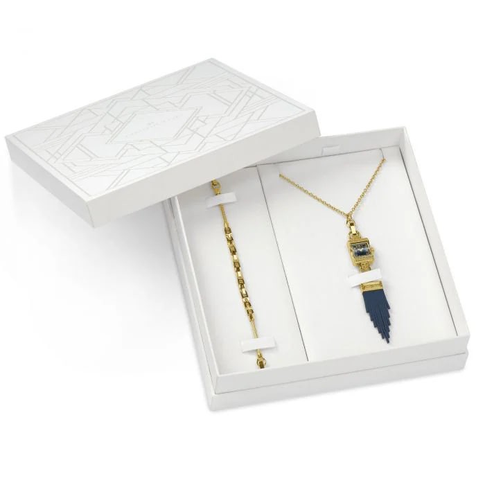 The Hamilton women's necklace watch combines the characteristics of a timepiece and jewelry, highlighting the Art Deco style aesthetics of the 1930s. Featuring a yellow gold PVD-coated stainless steel case with delicate decoration and a blue dial, this pendant watch can be worn as a watch on a bracelet or as part of a necklace with an adjustable chain and midnight blue tassel pendant. . All supporting elements are housed in exclusive packaging inspired by the iconic geometric patterns of the time.