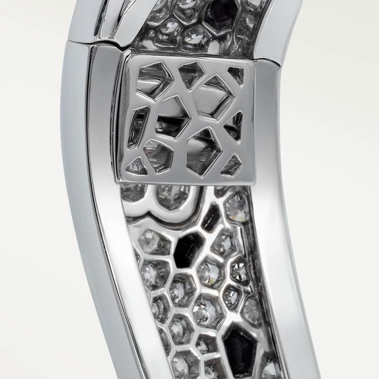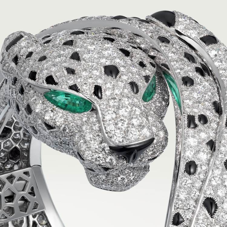 PANTHÈRE DE CARTIER bracelet - 950‰ platinum, set with 2 emerald panther eyes, 146 onyx leopard spots, 1 onyx leopard nose, 1,132 round brilliant-cut diamonds totaling 16.05 carats.