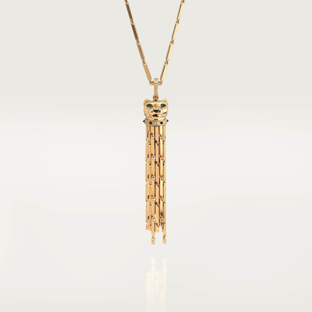 PANTHÈRE DE CARTIER necklace, 750‰ yellow gold, black lacquer, set with 18 round brilliant-cut diamonds totaling 0.34 carats. Emerald, onyx.
