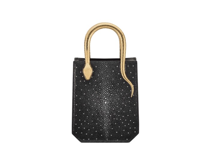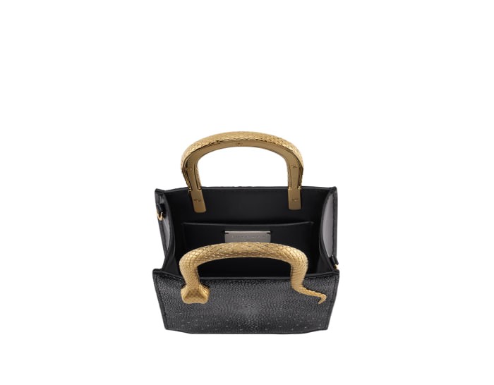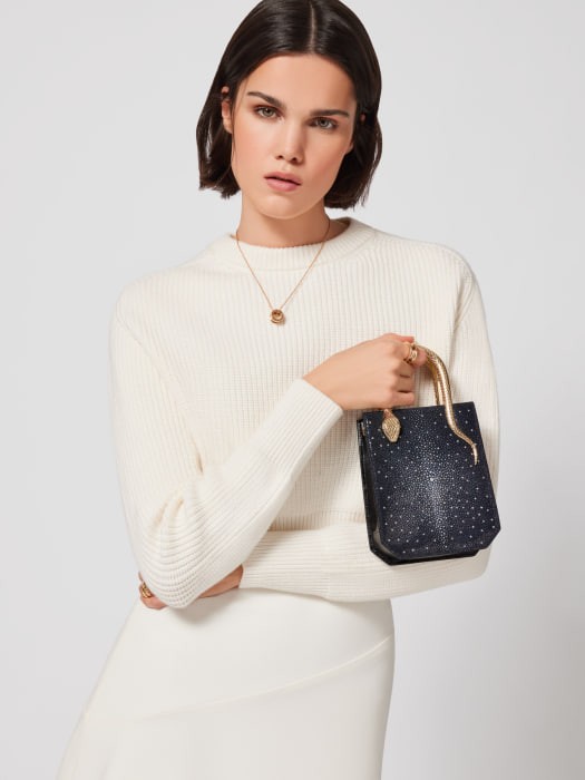 The SERPENTINE series mini tote bag is made of black diamond glitter pearl fish leather. The sides are made of soft and wear-resistant black urban calfskin. The texture is exquisite and extraordinary, sparkling like pavé diamonds, and the diamonds hand-set on it. The particles complement each other. This piece features two snake-shaped handles, embellished with engraved scales and red enamel eyes. The design is inspired by the bold and uninhibited SERPENTI series antique collection necklaces of the 1960s. It cleverly combines the crisp vertical shape with jewelry element details, which is reminiscent of See the graceful and agile posture of the spirit snake. Featuring a leather shoulder strap, this stylish bag features a single open compartment, an internal spliced pocket and an internal metal plaque engraved with the Bulgari logo. 13 X 17.5 X 5.5 cm - 5.1 X 6.9 X 2.2 inches. made in Italy.